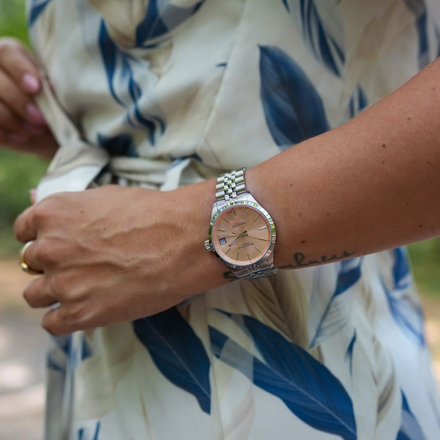 - Gehäuse: Gehäuse Edelstahl, Zifferblatt rosé, Ø 34,0 mm, Höhe 9,1 mm