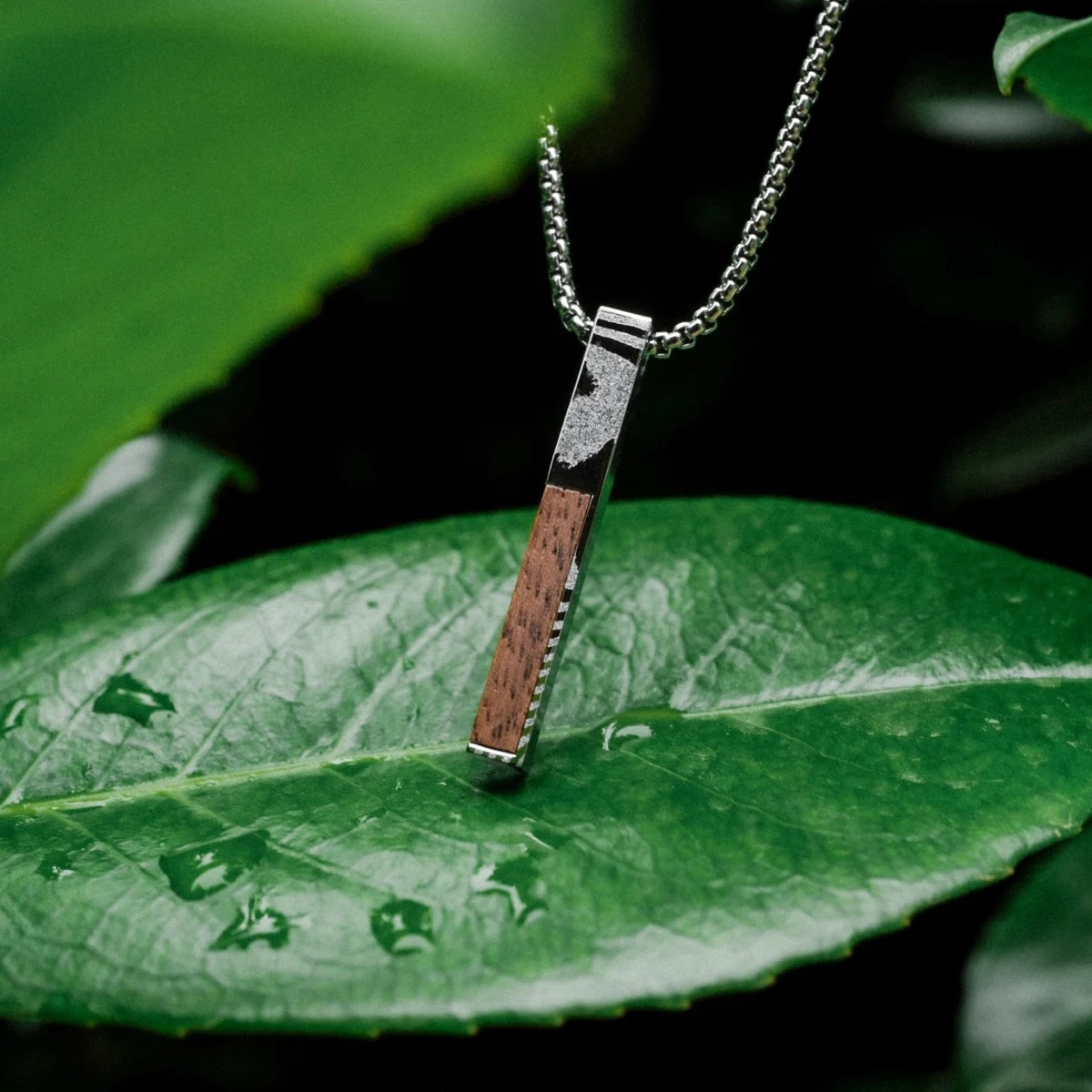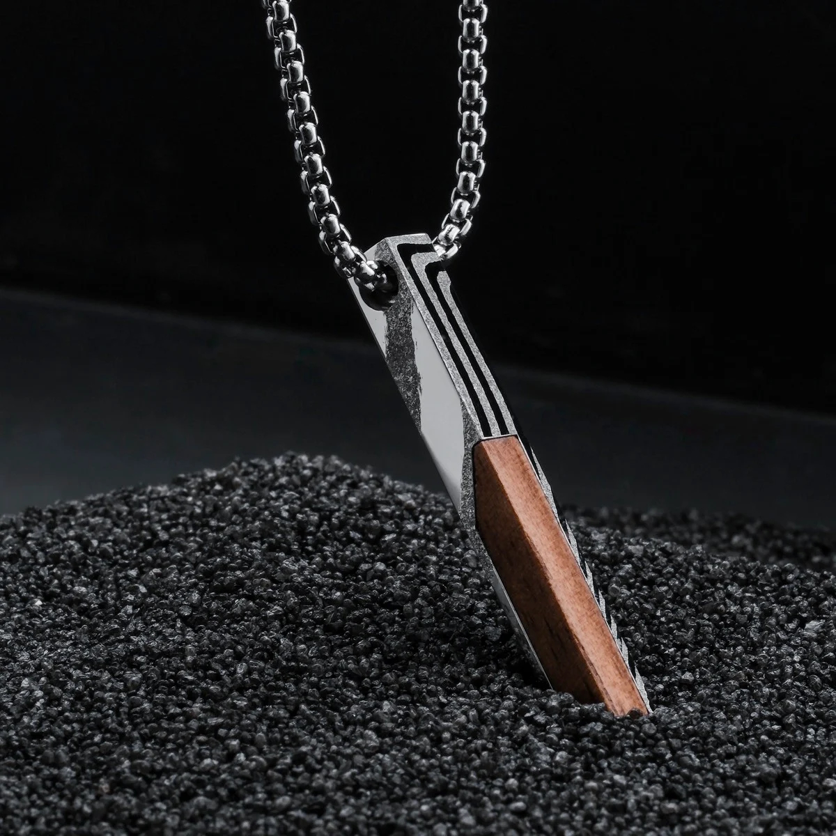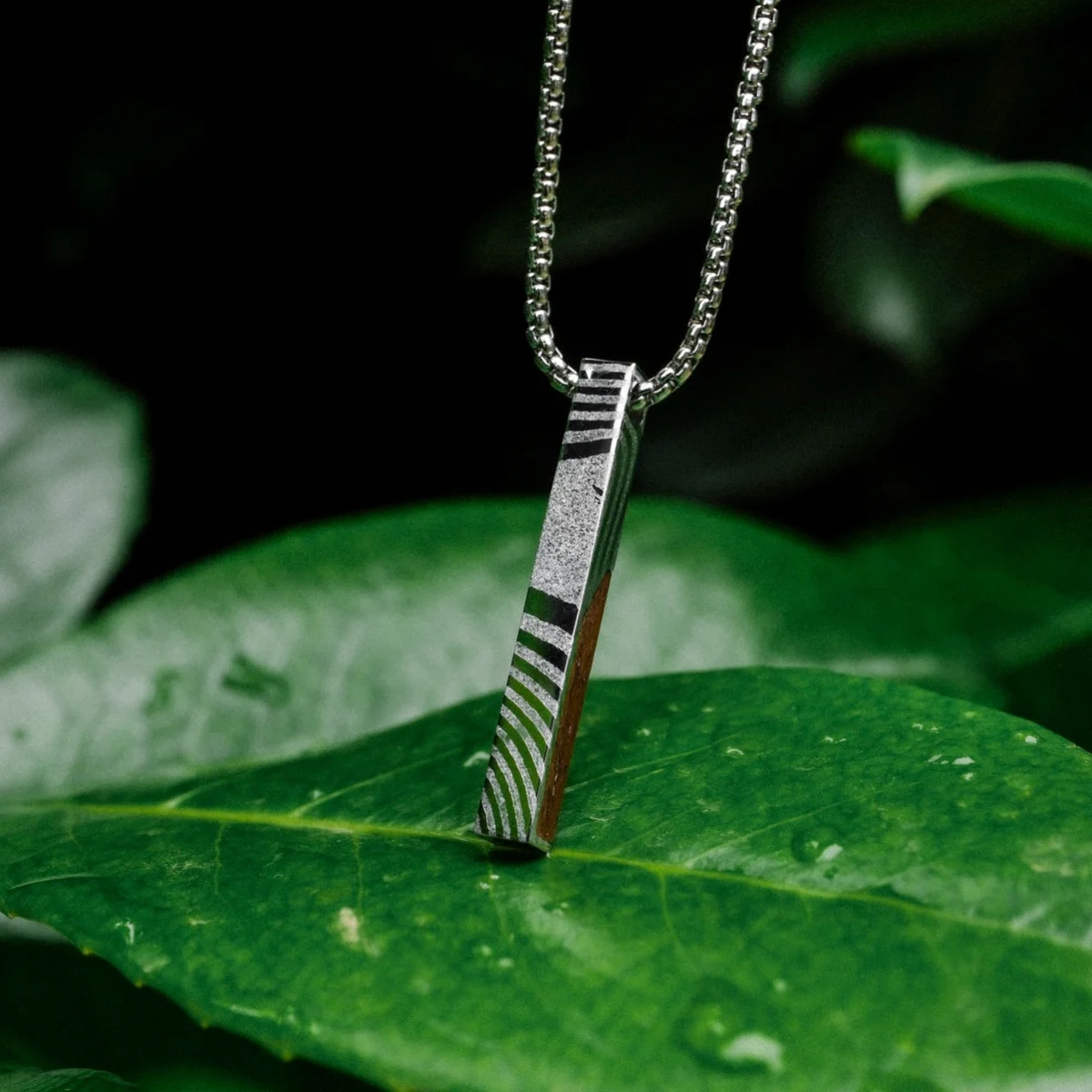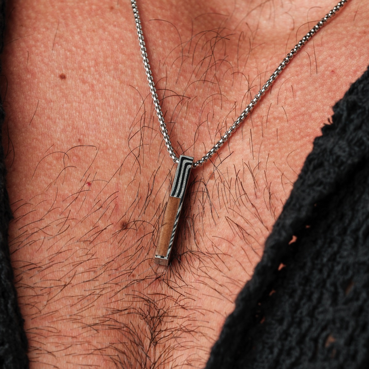 Finde mit unserer Halskette aus echtem Walnussholz und spannendem Damaszenerstahl ein perfektes Accessoire, das alle Blicke auf dich zieht.