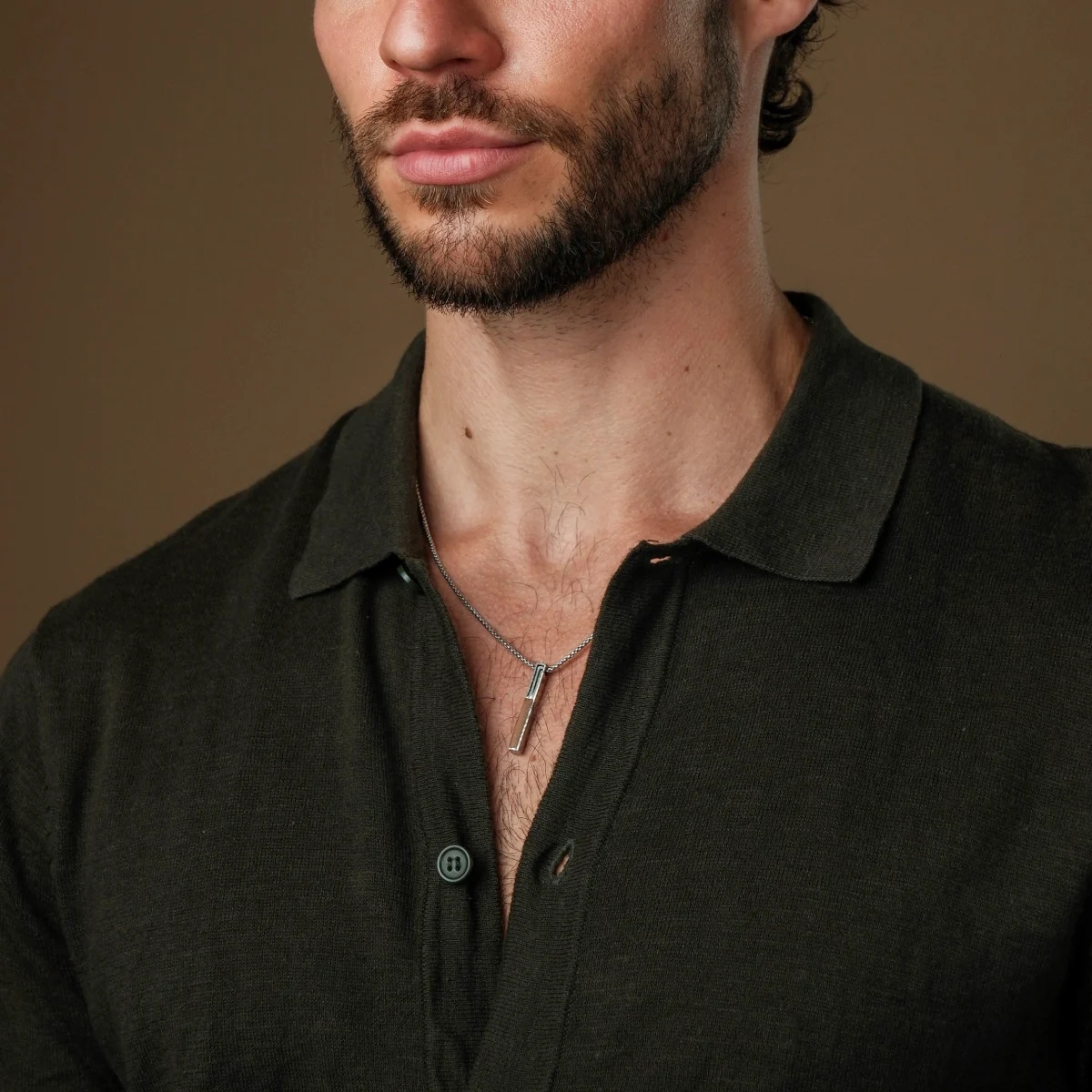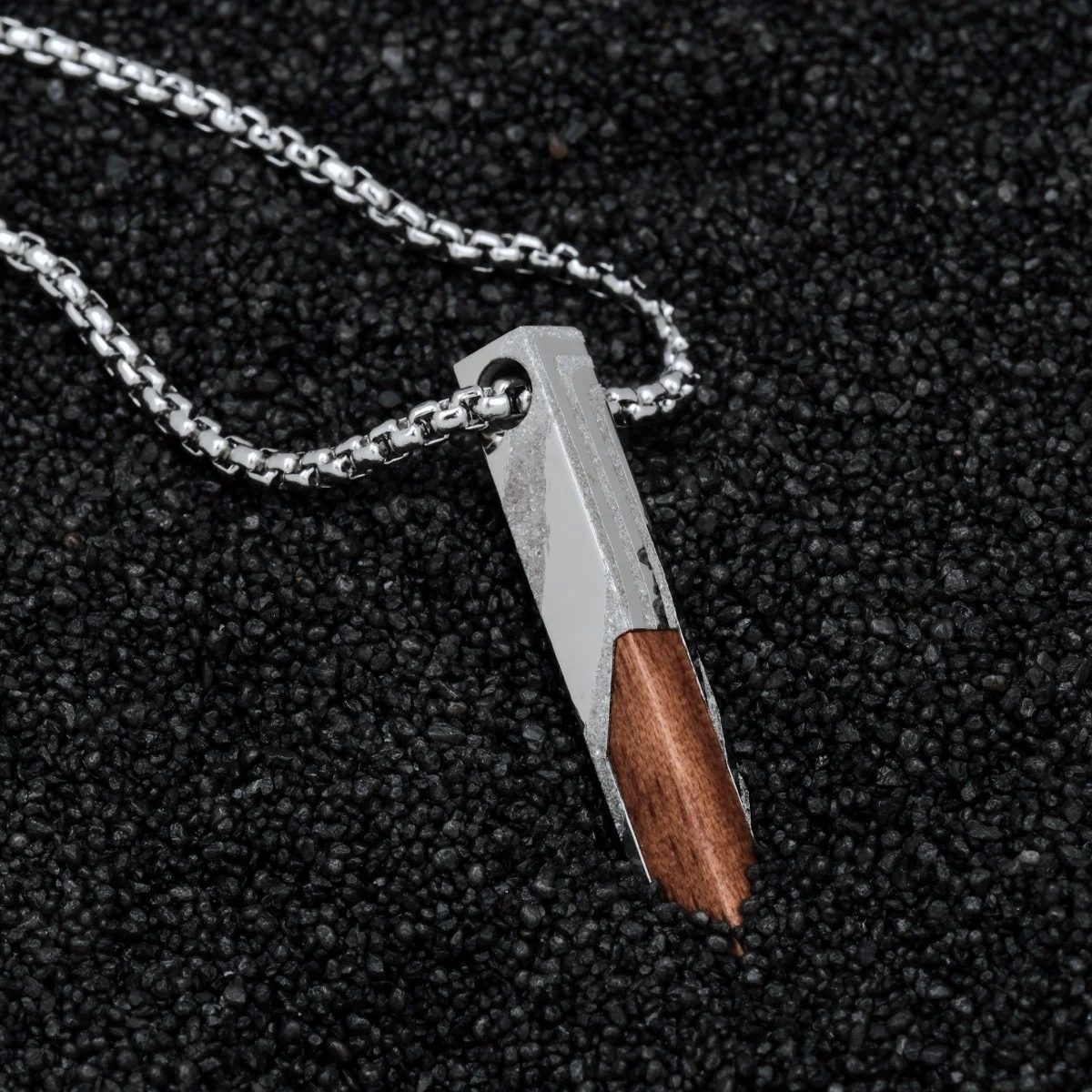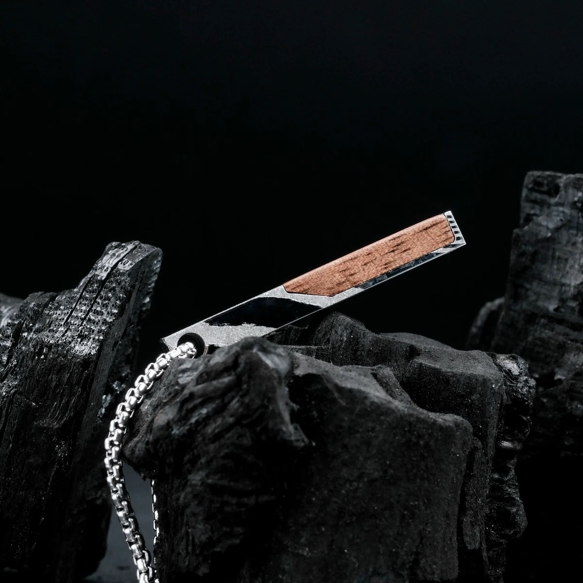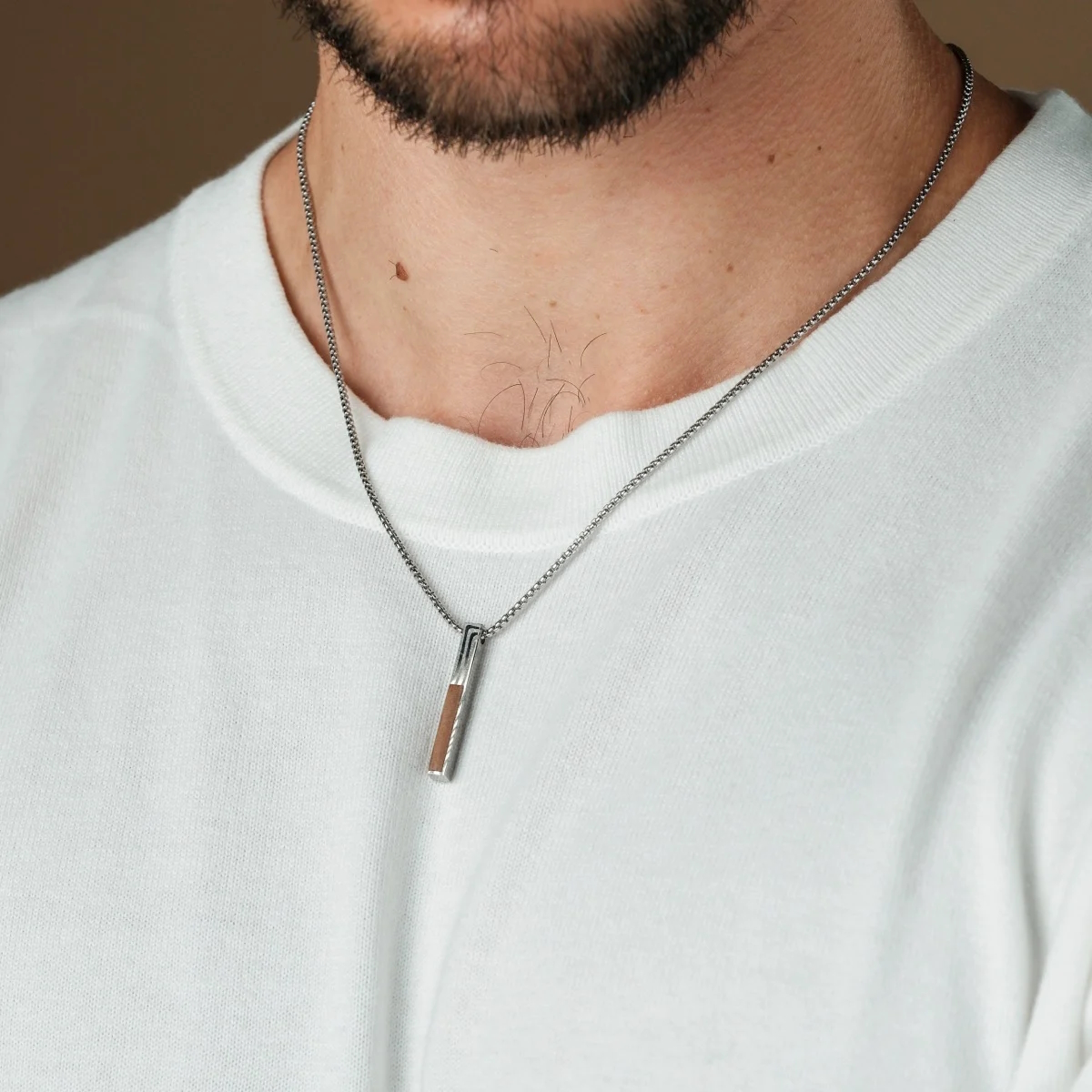 Finde mit unserer Halskette aus echtem Walnussholz und spannendem Damaszenerstahl ein perfektes Accessoire, das alle Blicke auf dich zieht.