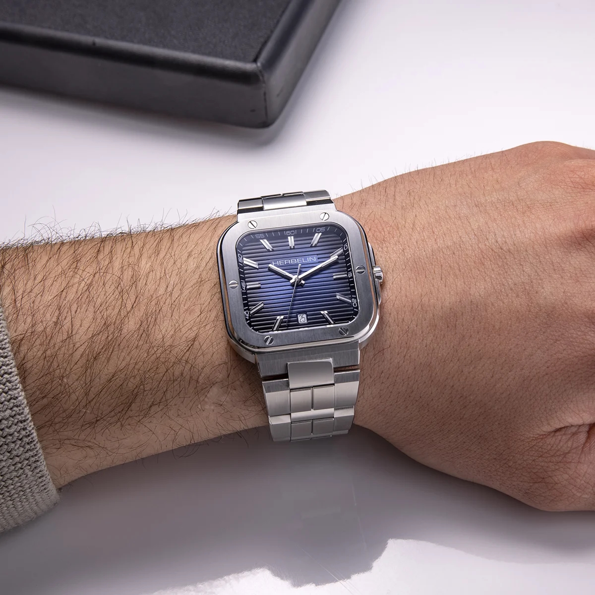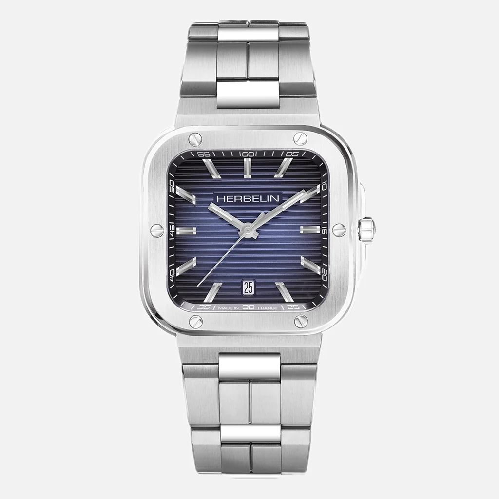 Mit ihrem kantigen quadratischen Gehäuse präsentiert sich die CAP CAMARAT im Retrostil der 70er Jahre. Die Dreizeigeruhr von HERBELIN ist das ideale Timepiece für Männer, die ebenso viel Wert auf ausdruckstarkes Design wie auf Funktionalität und Alltagstauglichkeit legen.