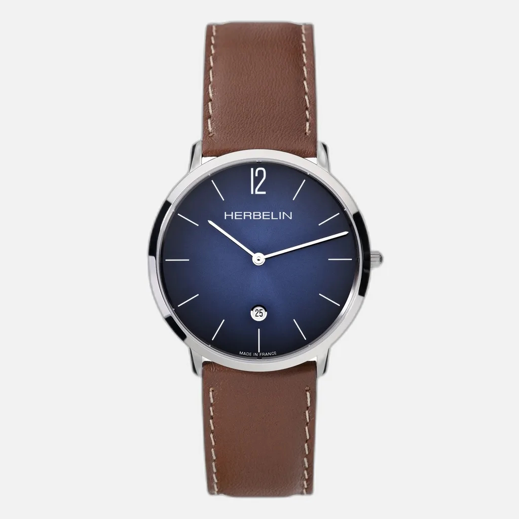 Die CITY Uhren von HERBELIN sind wahrlich klassisch zu nennen: zurückhaltend am Handgelenk, klar in der Optik und puristisch im Design. Die CITY Armbanduhren unterstreichen das Understatement seiner Träger und sind unaufdringlich in ihrer Wirkung. Toll ist die Kombination des extraflachen Gehäuses mit einem attraktiven blauen Zifferblatt und dem goldbraunen Armband. Einfach schick, trendy und elegant zugleich.