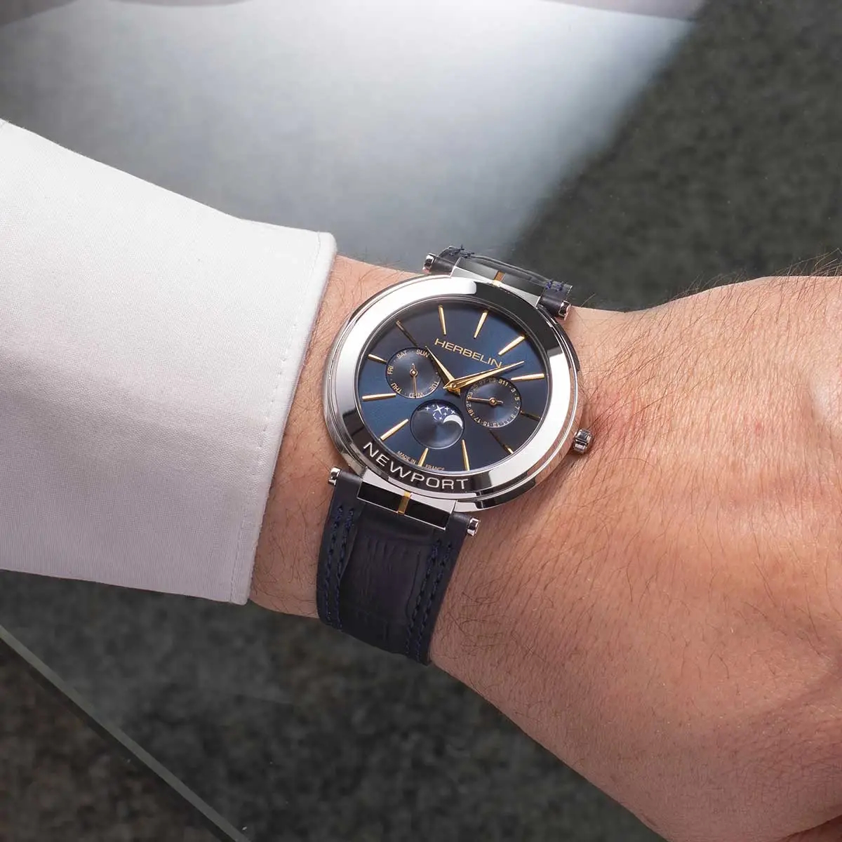 Angetrieben wird die Newport Slim mit Mondphasenanzeige von dem Schweizer Quarzwerk 10 1/2 RONDA 706.1. Dieses ermöglicht die Anordnung einer Mondphasen-, Wochentag- und Datums-Anzeige in der Optik von Totalisatoren auf dem Zifferblatt. Diese beleben auch optisch das schwarzblaue Zifferblatt, das überdies mit schönen Effekten überrascht, die je nach Lichteinfall tiefblau oder in Marineblau aufscheinen. Ein wunderbares Detail, wie wir finden. Die facettierten Indizes und Zeiger aus Edelstahl in gelbgoldfarbener Optik sind bewusst schlank und minimalistisch gehalten. Sie bescheren der Gesamtkomposition eine gute Ablesbarkeit. Geschützt wird das attraktive Zifferblatt von einem kratzfesten Saphirglas. Konsequent „slim“ ist natürlich auch das hochwertige Lederband. Es hat einen hohen Tragekomfort und schließt sicher mit einer Dornschließe aus Edelstahl. Der Zeitmesser mit bicolorfarbenen Akzenten überzeugt mit seiner klassisch urbanen Ausstrahlung, Kompetenz und viel Liebe zum Detail! Unverwechselbar HERBELIN!