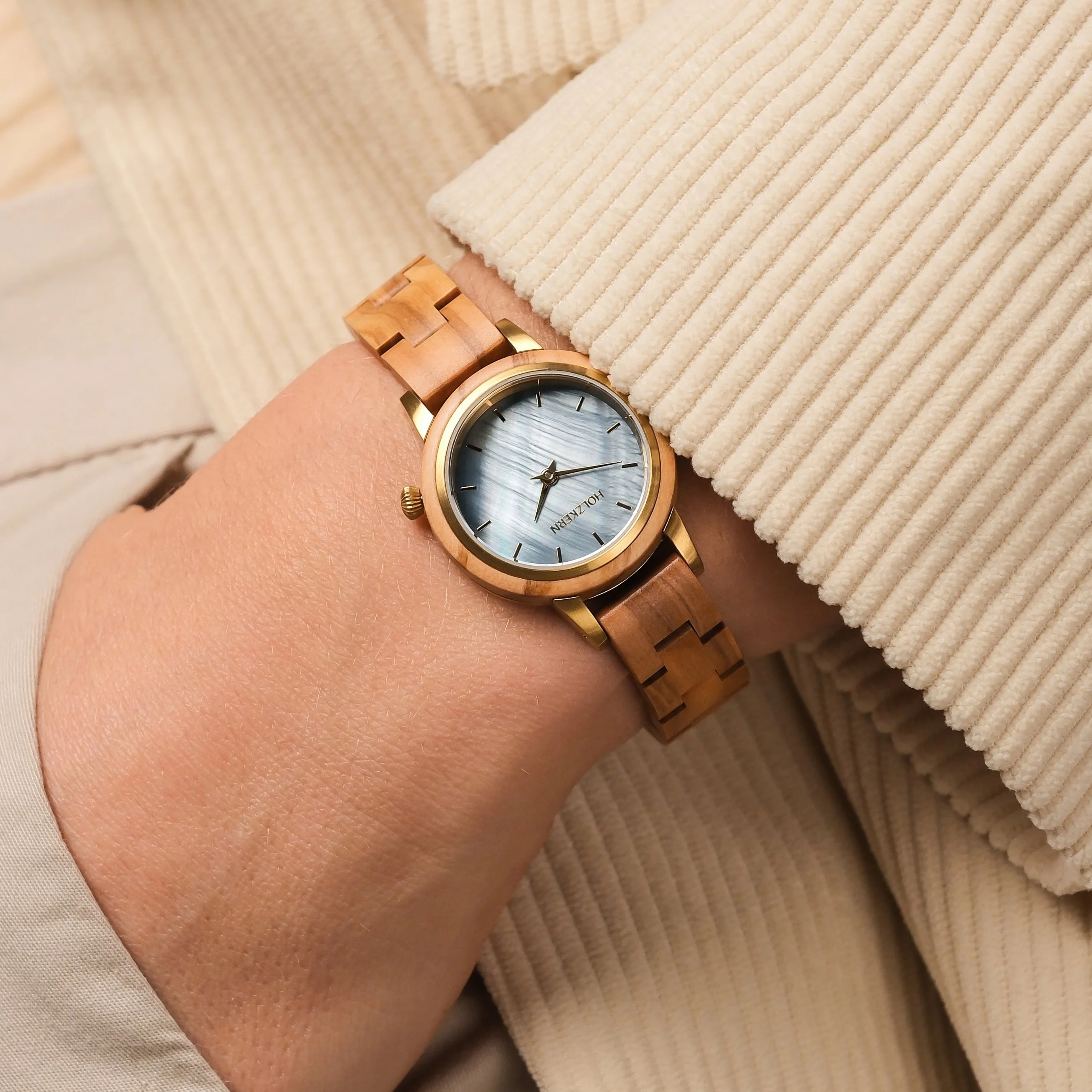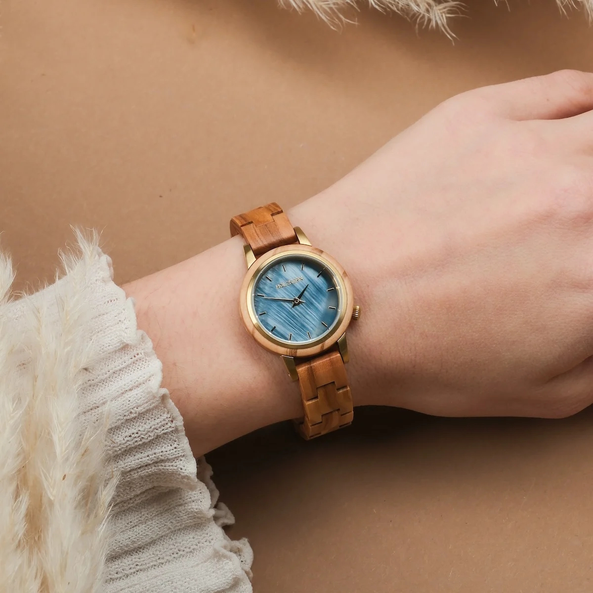 - Armband: Größenverstellbares Armband aus Olivenholz (passt auf jedes Damenhandgelenk)